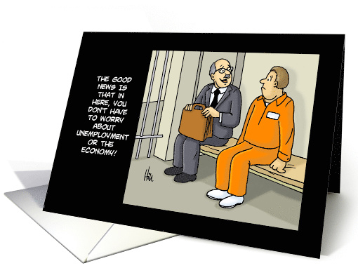 | Artist Notes: | Humorous law day card with a cartoon of a lawyer in the jail talking to his client in prison garb. The words say, The good news is that in here you don't have to worry about unemployment or the economy! Inside says, Celebrating Law Day, reflecting on the role of law in our society. |