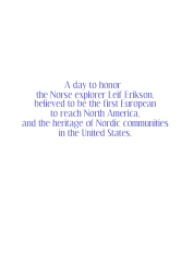 Leif Erikson Day, celebrated on October 9th, is a holiday that honors the sailing of Leif Erikson, on a large carved wooden boat that had dragon head at the bow and dragon's tails on the stern of the boat. He was the son of Erik the Red, who settled Greenland and Erik was born in the 10th century. He sailed on his boats to North America around the year 1000CE and named the area he explored Vinland, making him one of the first Europeans in North America. This card has one of Erik's boats in the design, with a huge sail of red and white stripes, above the wooden dragon head at the bow of the ship. Additional wording of "Leif Erikson Day" fills the ocean water, below the ship. The inside wording of the card says "A day to honor the Norse explorer Leif Erikson, believed to be the first European to reach North America, and the heritage of Nordic communities in the United States."