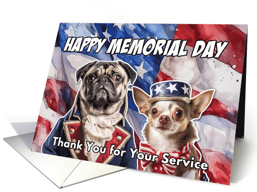 Artist Notes: | A Pug and a Chihuahua (part of the "Pug in a Suit" Series) in patriotic garb on a stars and stripes USA watercolor background with the text "Happy Memorial Day Thank You for Your Service". A patriotic card to send to any red-blooded American for Memorial Day. |