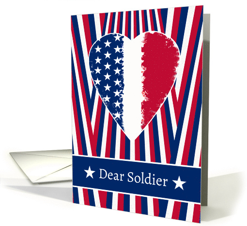 Artist Notes: | Dear Soldier text on the cover flanked by two white stars. Patriotic Memorial Day greeting card for a special soldier. American colors and symbols on a roughly painted heart. |