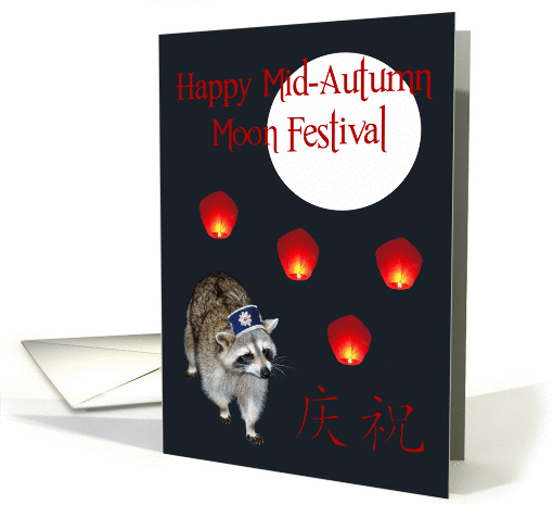 Wish someone a Happy Mid-Autumn Moon Festival with an adorable raccoon wearing a cute Chinese hat. Background has paper candles and a moon.