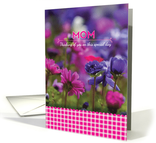 Artist Notes: | Cheerful photograph of bright pink and purple spring flowers with pretty gingham graphic and scalloped edge tell mom you're thinking of her on her special day. Mom, I'm thinking of you on this special day. We share so much. Our love of family, precious memories, and little things, too. Our love of flowers, and gardens, and spring. Although we're miles apart, You always feel close to my heart I miss you, mom, and wish you Happy Mother's Day! |