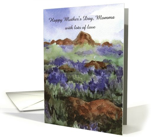 | Artist Notes: | A custom personalized Happy Mother's Day card featuring a desert landscape in spring with blooming purple lupine flowers among the sagebrush and rocks under a warm blue sky. |