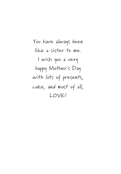 | Inside: | You have always been like a sister to me. I wish you a very happy Mother's Day with lots of presents, cake, and most of all, LOVE! |