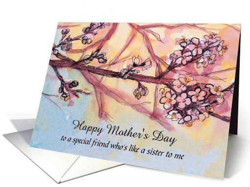 | Artist Notes: | Custom Happy Mother's Day greetings for a person who's like a sister to you featuring a branch of a blooming fruit tree in spring with soft pink blossoms in a sunrise sky hand drawn with ink and watercolor. |