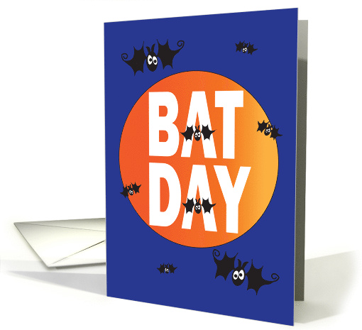 | Artist Notes: | The holiday known as Bat Appreciation Day, which occurs on April 17th, is a day to observe and appreciate the special animal known as a bat. This fun card acknowledges this flying black bird, with its jagged wings, as a group of them fly in front of a large yellow and orange full moon. Large graphic letters spell out the words "BAT DAY" with two large, black bats providing the crossbars across both "A"s in the words. The card's inside wording is "Observe and appreciate our friends, the bats, on Bat Appreciation Day!" |