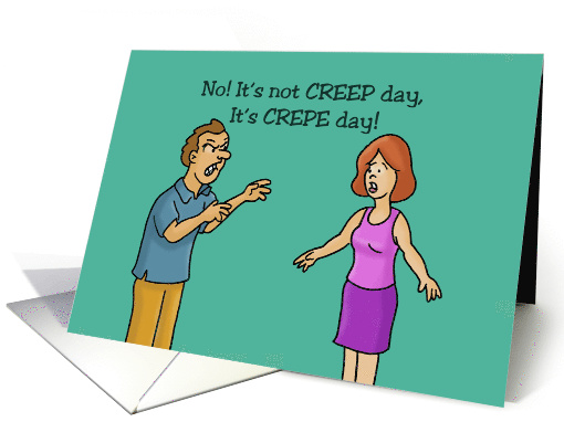 Funny Crepe Day (Feb. 2) card with a cartoon showing a man being creepy. The woman he is creeping up on says, No! It's not Creep day, it's crepe day! Inside says, So forget pancakes today and enjoy a warm thin crepe!