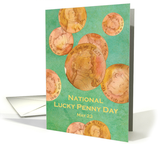 A card for National Lucky Penny Day on May 23 in honor of the Celebrate Every Day holidays featuring stylized copper penny illustrations done in colored pencil and watercolor on a warm green background.