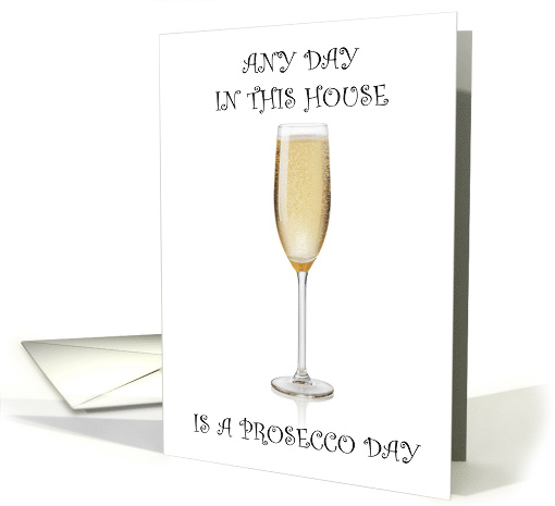 A stylish photograph of a tall stemmed glass full of sparkling prosecco, set against a crisp white background. The words 'Any day in this house is a Prosecco Day' accompany the image.