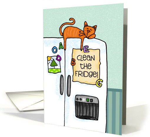 A ginger kitty sleeping on top of a fridge with a note on the door saying "Clean the Fridge!" Perfect reminder to send someone for national Clean your Refrigerator Day!