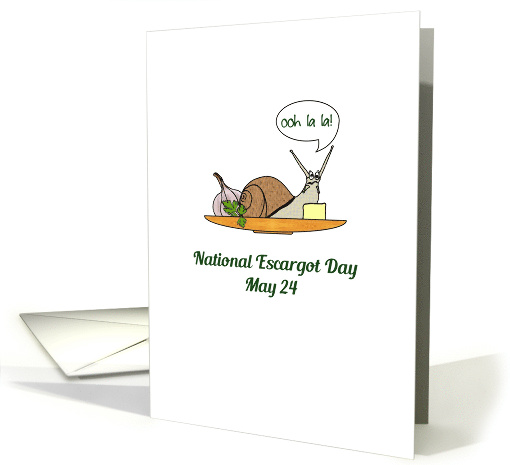 National Escargot Day on May 24 celebrates the famous French dish of cooked land snails in garlic, butter and wine. For this design we have a fun illustration of a dish on which sits a head of garlic, a knob of butter and some parsley sprigs. Sitting uncomfortably in the middle of all these ingredients is a snail. 'Ooh la la' is a French expression which can be translated as 'oh dear'. The inside verse 'Bon appetit' means 'enjoy your meal'.