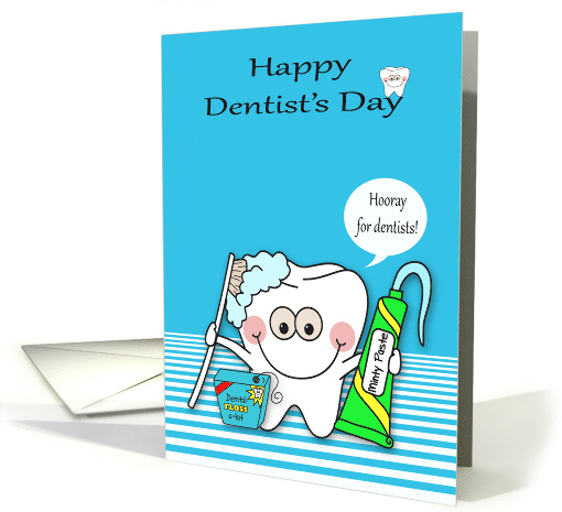 Wish anyone, in general, a Happy Dentist's Day, March 6th featuring an adorable happy tooth brushing itself with a large toothbrush holding a large tube of toothpaste in its other hand saying in a talk bubble "Hooray for dentists". Original design by Laurie Schneider, elements by Scrappin Doodles