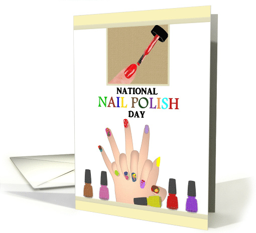 National Nail Polish Day is observed on June 1. There is a color for every occasion. This fun illustration shows red polish being applied to a finger nail. Below this image we have both hands clasped together with each nail painted in different colors, and some with nail art applied. We also have five bottles of polish in various colors.