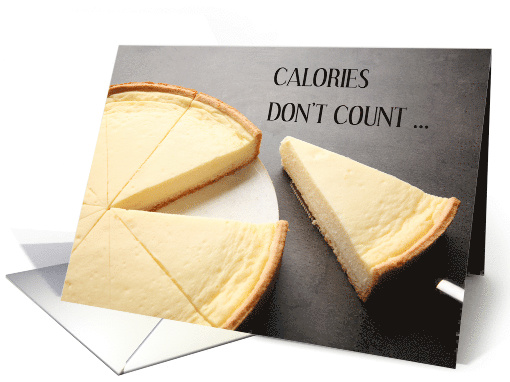 A photograph of an enticing original cheesecake, cut into slices with one slice being lifted out. The words 'Caloreis don't count ...' accompany the image.