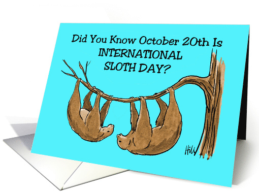 Humorous International Sloth Day (October 20) card with a cartoon of two sloths hanging from a tree branch. One says, Did you know that October 20th is International Sloth Day? Inside says, Is it worth climbing down from the tree?