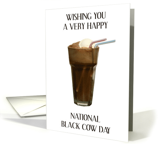 A photograph of a root beer float in a tall glass with two straws in it. The image is set against a white background and accompanied by the words 'Wishing you a very happy National Black Cow Day'.