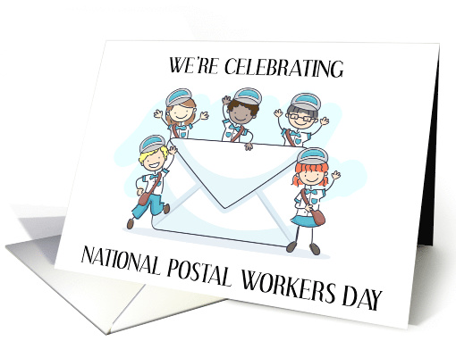A cartoon of a diverse group of children dressed as mail carriers, standing around an oversized envelope. The words 'We're celebrating 'National Postal Workers Day' accompany the image.