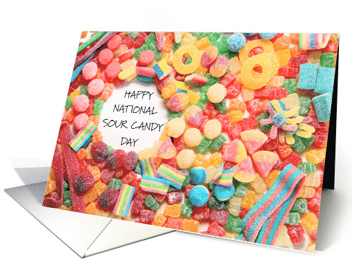 A colorful selection of sour candies with the words 'Happy National Sour Candy Day' written in a space made in the middle of them.