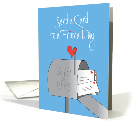This gray mailbox, that is stuffed with white envelopes stamped with red heart stamps, is telling us to "Send a Card to a Friend", a special day that is celebrated in February. The wording at the top of the blue card is hand lettered, in white, with these same words, topping the image of your friend's mailbox into which this card from you has just arrived. The inside wording is "Celebrating what a special friend you are on this fun holiday!"