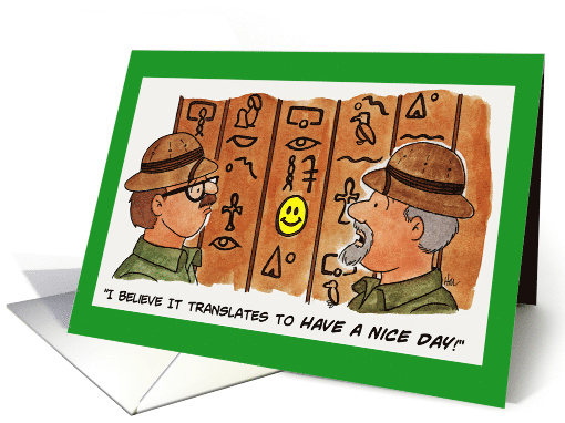 World Emoji Day (July 17) card with two Archaeologists looking at hieroglyphics in an Egyptian tomb. One of the hieroglyphs is a happy face emoji. The words say I believe it translates to have a nice day! Inside says, Celebrating World Emoji Day