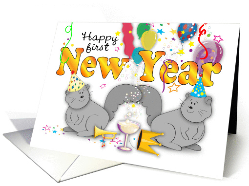| Artist Notes: | The first New Year as a couple should be celebrated! The cover of this card features my 2 happy grey squirrels, celebration and party elements, and 'New Year' in shades of orange. The inside message can be changed, if you wish. ©Gail Pepin |
