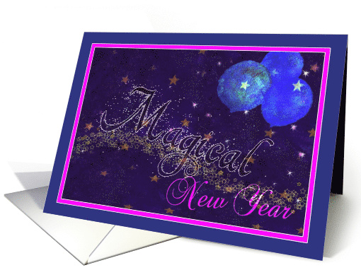 | Artist Notes: | Magenta & blue magical greeting for a lovely couple on their first new year together, flowing hand drawn script incorporate into design with balloons & twinkling stars on indigo blue background, colorful new year greeting by judith cheng |