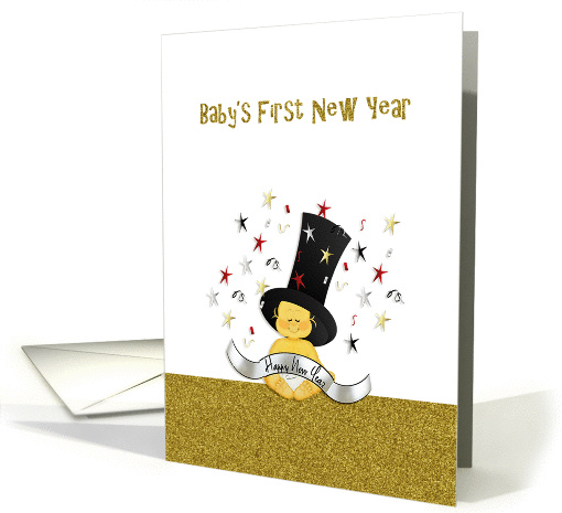 | Artist Notes: | Celebrate baby's first New Year with this festive card featuring a baby wearing a top hat surrounded by red, gold and silver stars with a gold glitter look border. (There is no glitter on the card.) Created with artwork by J.Rett Graphics |