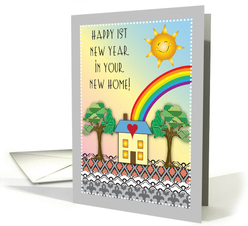 | Artist Notes: | To make someone feel good about the first new year in their new home, give this card to show you care. The cover features a folk art design with a house, heart, trees, happy sun, and a rainbow. There are colorful patterns to give the card a quilt appearance. The headline is in black. The inside message can be changed, if you wish. ©Gail Pepin |