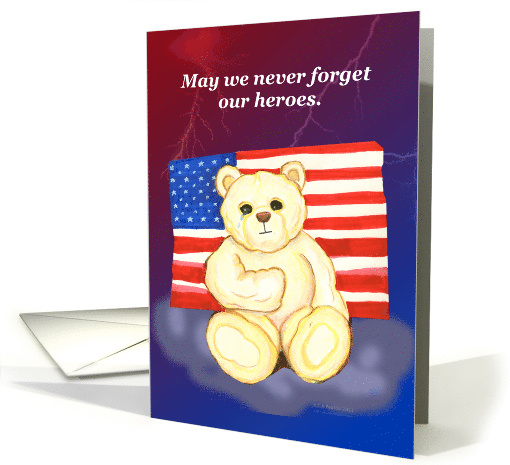 | Artist Notes: | Teddy bear sits against an American Flag with lightning in the background. A tear rolls down.He holds paw to heart. Inspired by 9/11, it honors heroes who defend our freedom and our country, from Patriot's Day, Memorial Day to Veteran's Day. art by starhorsepax, lightning by www.obsidiandawn.com |