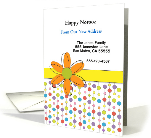 Customize the front and inner verse of this New Address / We've Moved Norooz card / Persian New Year card, illustrated with circles, dots and flower. Inner verse is customizable as well. Thank you ... Sheryl Kasper Card Store