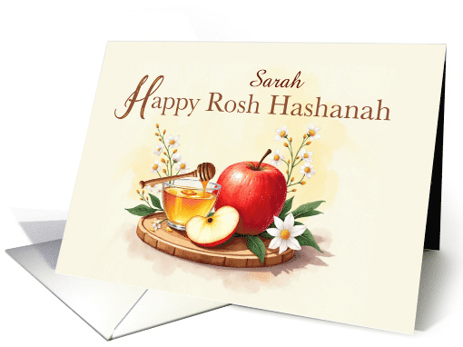 Send warm Rosh Hashanah greetings in a meaningful way with this personalized design for Sarah. A bright red apple, a golden bowl of honey, and soft white blossoms are beautifully illustrated to symbolize hope for a sweet and joyful year. The custom name feature makes this card extra special, turning a traditional holiday greeting into a keepsake she will treasure. A heartfelt way to celebrate Jewish New Year with family or friends. Explore more designs from my stores: