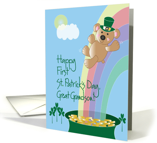 Your brand new little baby Great Grandson is going to love all the colors he can see in this darling card with a cute little bear sliding down the St. Patrick's Day rainbow. The rainbow is filled with the colors of pastel green, blue, lavender, orange and yellow, colors that will catch your Great Grandson's eye, as he looks at the card you sent him. The green hand lettered message is "Happy First St. Patrick's Day Great Grandson", as the little brown bear slides down the arch of the rainbow, wearing his tall, green leprechaun hat with a huge buckle on the front, ready to land in the big green pot of gold coins.