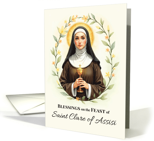 A peaceful watercolor devotional portrait of St. Clare of Assisi, holding a golden Eucharistic chalice representing her deep devotion and defense of the Blessed Sacrament. Shown in her traditional Poor Clare habit, her gentle, prayerful expression reflects her great love of Christ. Her feast day is celebrated on August 11. A beautiful way to honor this beloved saint, known for her courage, purity and steadfast faith. See more designs from Sandra Rose Designs at: Sandra Rose Designs: https://www.greetingcarduniverse.com/sandrarosedesigns Sandra Rose Designs Two: https://www.greetingcarduniverse.com/sandrarosedesignstwo