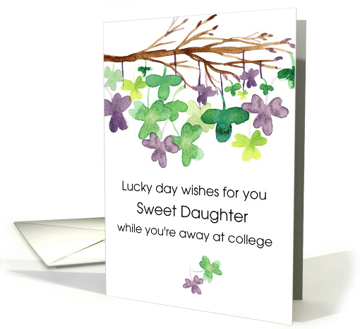 | Artist Notes: | A custom Happy St. Patrick's Day greeting card to a daughter away at college (or other special family member/friend) decorated with a branch of clover and shamrocks dangling from the twigs hand painted with watercolor. |