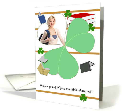 | Artist Notes: | St. Patrick's Day greeting from parents to college students. This design, customizable for the name and photography, features books and a huge shamrock with the photograph framed in one of the three leaves. |
