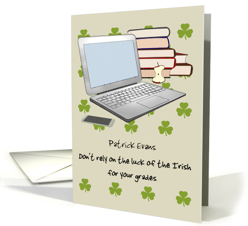| Artist Notes: | St. Patrick's Day greeting from parents to college students. This custom name design features a laptop and a cellphone side by side. Behind the laptop sits a stack of books and an apple core. Rows of green shamrock sit on a yellow-gray background. |