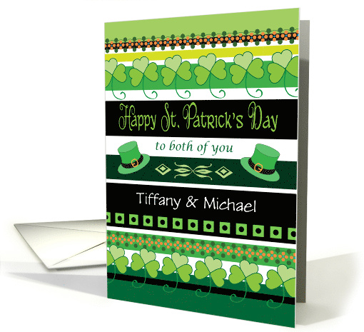 Give a special couple this custom St. Patrick's Day card that features two green hats, shamrocks, various designs, and colors of black, white, orange, and shades of green. There is plenty of room for the personal names. You may change the inside message, if you wish. ©Gail Pepin