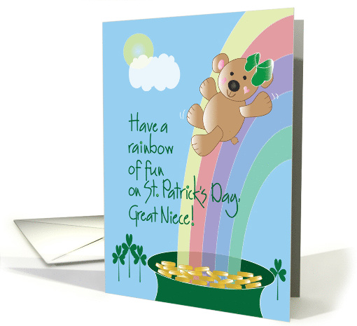Won't your Great Niece enjoy seeing this adorable little brown bear, with her pink heart cheeks and her huge green bow o one of her ears, as she plays on St. Patrick's Day, and slides down the colorful arches of the rainbow, right into the pot of gold! The green pot is filled with glimmering coins that reflect the sunlight from above. In between the sun and the coins, is the card's hand lettered message, in green, with the words "Have a rainbow of fun on St. Patrick's Day, Great Niece!"