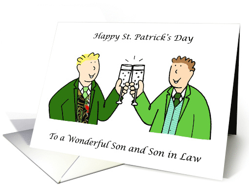 A fun card to celebrate St. Patrick's Day for any much loved Son and Son in Law. A pair of men dressed in green suits and waistcoats toast each other in celebration, with glasses of champagne.