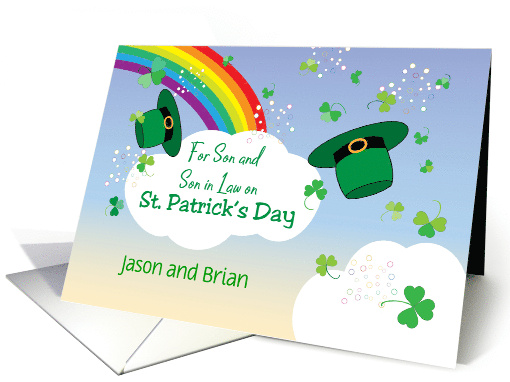 Give this colorful custom name St. Patrick's Day card to that special son and son in law. The cover has a sky background, rainbow, two white clouds, two leprechaun hats, lots of shamrocks, and a green headline. The personal names are placed at the bottom. The inside message can be written any way you choose. ©Gail Pepin