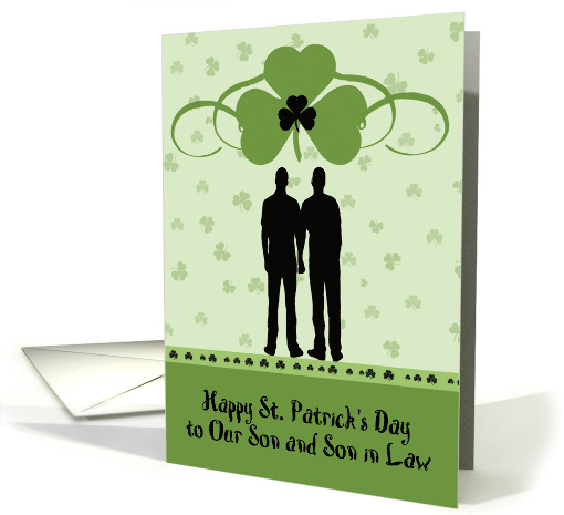 St. Patrick's Day for Son and Son in Law. This is a light green card with a silhouette of two men holding hands. The silhouette is black as well as part of the design and words. The rest of the design is a large double shamrock with swirls, and the background has smaller green shamrocks. Perfect card for the purpose. Thanks to Pixabay and Obsidiandawn for some of the elements in the design.