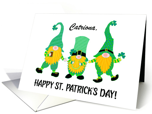 A fun St. Patricks's Day greeting card for you to customize with the name/s of the recipient/s, with three jolly, dancing leprechauns. The leprechauns are dressed in shades of green, with black shoes and they all have long, bright, ginger beards. one is carrying a glass of beer, one has a lucky horseshoe and the other one has a large shamrock leaf in his hand. The front cover greeting begins with a large space for you to add the name/s, with HAPPY ST. PATRICK'S DAY!'' at the bottom. The inside message is just a suggestion, which you can change or delete if you wish.