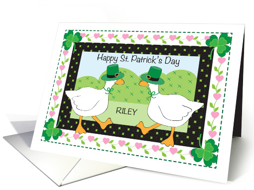 | Artist Notes: | This custom name St. Patrick's Day card features two white geese wearing shamrock hats. The cover also has a border of pink hearts and four shamrocks in the corner. The black headline is at the top and the names are placed between geese. You may change the inside message if you wish. ©Gail Pepin |