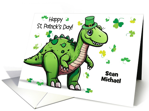 | Artist Notes: | Give this custom name St. Patrick's Day card to friends and family this year. The cover features my digital cartoon dinosaur wearing a leprechaun hat, shamrocks, and a black headline. The custom name/names are placed at the bottom right of the card. You may change the inside message, if you wish. ©Gail Pepin |