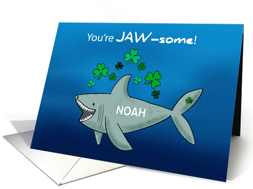 | Artist Notes: | Celebrate someone special this St. Patrick’s Day with a card that’s as unique as they are! A cheerful shark swims in a vivid ocean surrounded by shamrocks, creating a whimsical design. Add their name to the front for a personal touch they’ll treasure. |