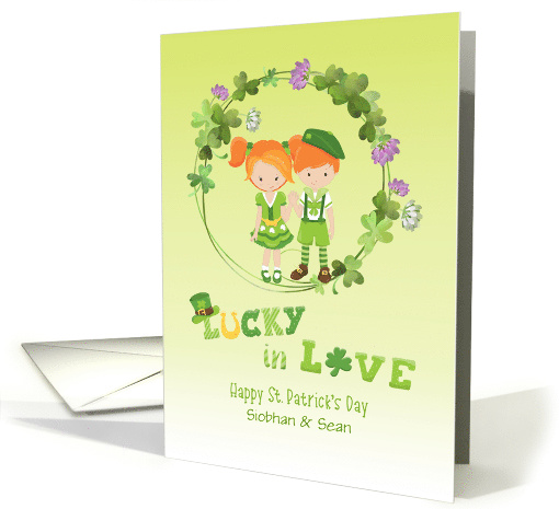 | Artist Notes: | Personalize the front of this sweet St. Patrick's Day card with the name or relationship of a special couple. There is a wreath decorated with flowers and clover and a cute Irish couple wearing traditional outfits. The text reads "Lucky in Love" and is made of a variety of patterns and symbolic Irish accents. |