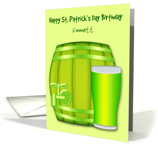 | Artist Notes: | Wish anyone in general Happy St. Patrick's Day Birthday with an adult humor, custom name card featuring a barrel of beer and a glass of green beer with a head of foam on a greenish, yellow background with dark green text. Front has a text box for the name of the recipient or whatever you choose, it's up to you. Example name Emmett. Design by Laurie Schneider/Elements by Scrapbookingmad/Macatelier |