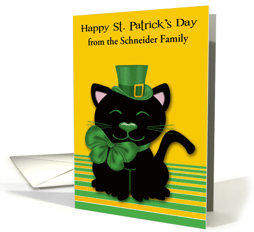 Wish anyone, in general, a Happy St. Patrick's Day with a humorous, custom name card featuring a cute black cat wearing a leprechaun hat with an adorable, big green bow on a green and gold background with black text. The front has a text box for the name, names of the recipient, recipient or your name, names or whatever you choose, it's up to you. Design by Laurie Schneider, elements by Digital Designs by Elena, Dillies Corner Designs. Just for fun: Leprechauns are believed to live mainly in areas of woodland and forest. People have spotted them near fairy mounds.