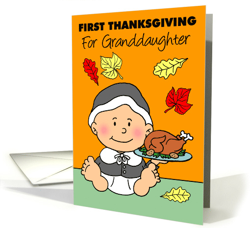 Granddaughter's First Thanksgiving featuring a cute, cartoon baby pilgrim. The baby girl is holding a turkey and sits against an orange background. Falling, colorful leaves surround her. A cute design for a newborn grandchild on Thanksgiving.