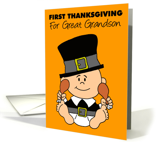 Great Grandson's First Thanksgiving featuring a cute, cartoon baby pilgrim. The baby is holding turkey drumsticks and sits against an orange background. A cute design for a newborn great grandson on Thanksgiving.